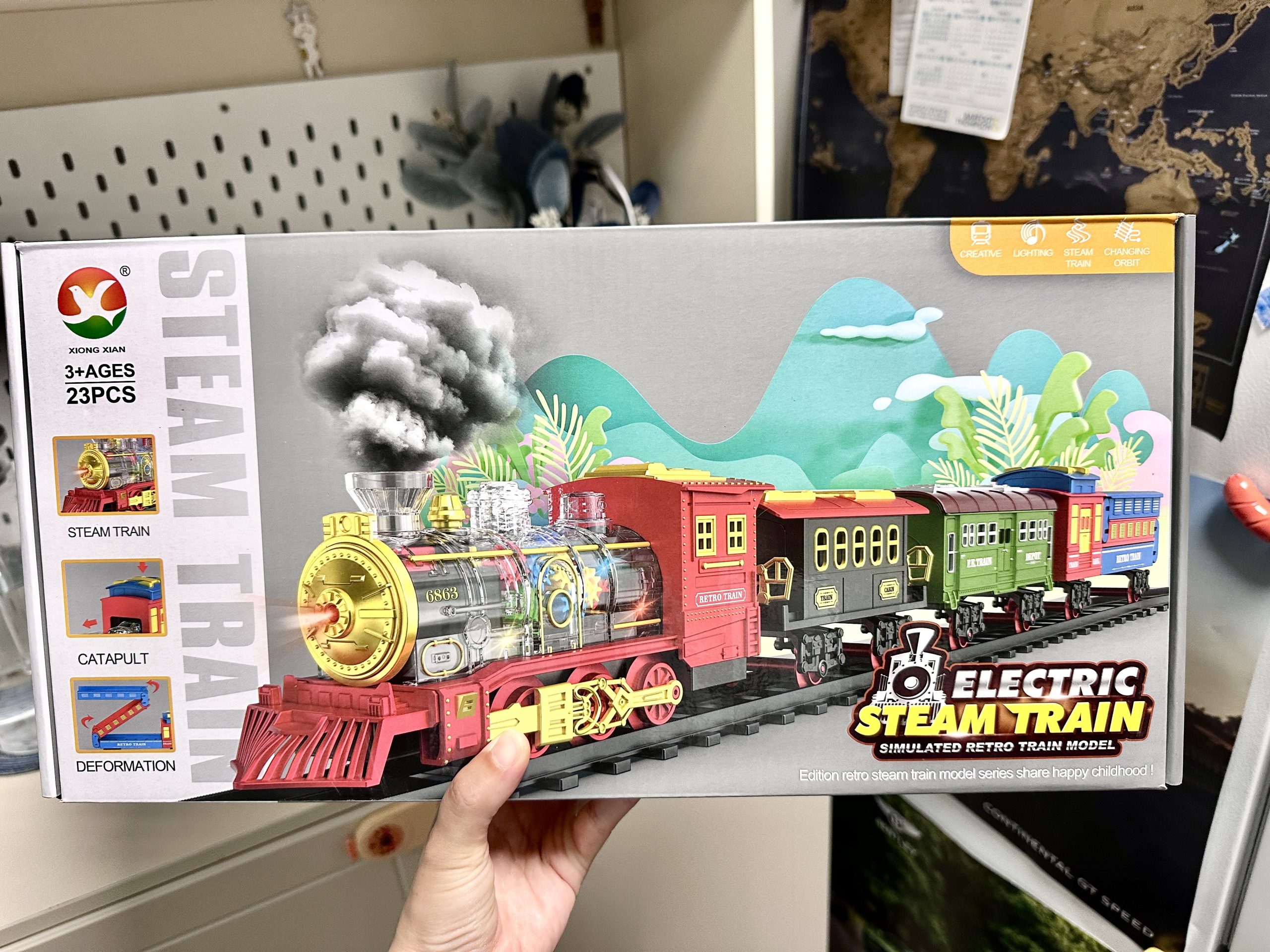 Product include a locomotive, 3 train cars, 12 tracks, 24 track connection locks, 4 alloy cars and a water bottle.